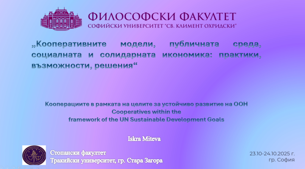 Научна конференция „Кооперативните модели, публичната среда, социалната и солидарната икономика: практики, възможности, решения“ – 23.10.2025г.